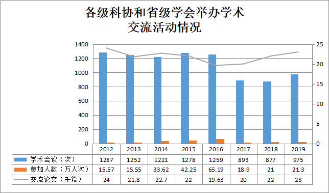 各级科协和省级学会共举办学术会议975场次,参加人数21.3万人次,交流论文2.3万篇。