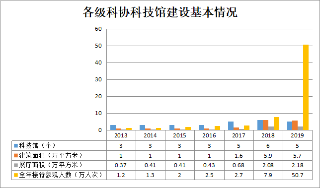 截至2019年底,各级科协拥有所有权或使用权的科技馆[23]5个。总建筑面积55700平方米,展厅面积21817平方米。已实行免费开放的科技馆5个。科技馆全年接待参观人数50.7万人次。流动科技馆2个。科普活动站(中心、室)1126个,全年参加活动(培训)人数176.0万人次。科普画廊建筑面积(宣传栏、宣传橱窗)[24]1.8万平方米,全年展示面积5.0万平方米。科普大篷车8辆,全年下乡次数157次。科普大篷车全年下乡行驶里程2.1万公里,受益人数3.9万人次。