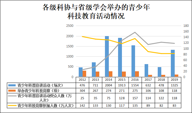 各级科协和省级学会举办青少年科普宣讲活动1325场次,青少年科普宣讲活动受众人数117.6万人次。举办青少年科技竞赛118项,参加竞赛的青少年83.2万人次,获奖人数3.8万人次。举办青少年科学营[26]43次,参加人数4880人次。编印青少年科技教育资料11种,印数3.6万册。举办青少年科技教育活动和培训1191场次,参加培训人数20.1万人次。通过中学生英才计划[27]培养学生304人。