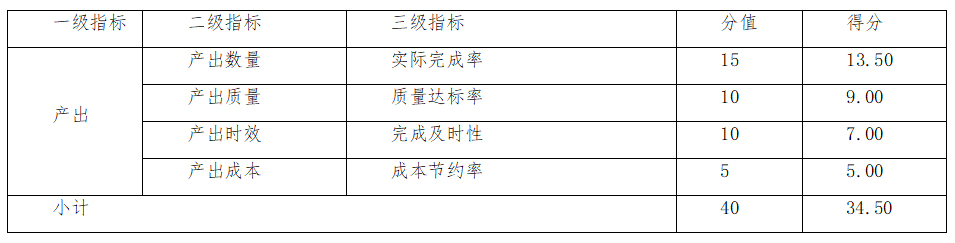 截至2020年12月31日,项目年初拟开展的9个子项的工作,虽然大部分工作能够序时、按计划推进,但截至评价时点(2021年5月20日),仍有衍生品批量制作尚未完成,舆情监测周报尚有2期未完成,年度产出效率有待提升。该指标分值40分,得分34.50分。评分见表。