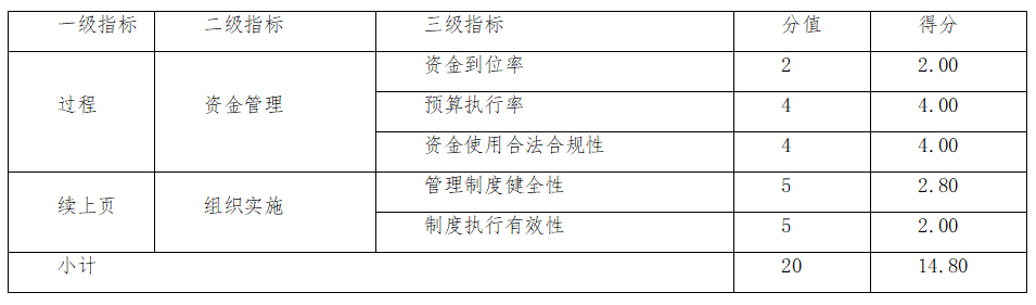 项目预算资金到位率100%,预算执行率为99.93%,资金支出合规性较好,但委托业务费方面的管理办法不够健全、缺少整体实施方案及成果验收程序、合同约定一次性付款的情况居多,制度执行有效性有待提升。该指标分值20分,得分14.80分。评分见表。