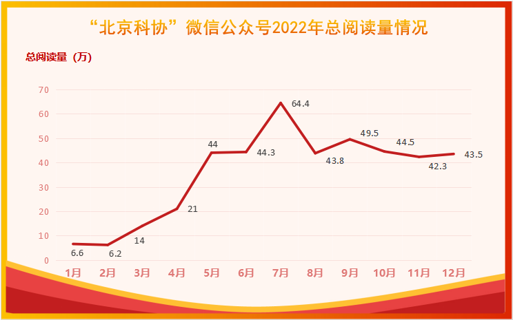 “北京科协”微信公众号全年发布文章2363条,粉丝数从年初的7.1万增长到10.6万;月度发布文章数量从130条增长到226条;月度阅读数从6万提升到43万,增幅达到617%。全年传播高峰出现在7月份市科协“十大”期间,单月阅读量达到64.4万;次高峰出现在9月份北京科学嘉年华期间,单月阅读量为49.5万。