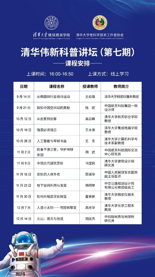 三年来,清华大学老科协联合清华大学继续教育学院通过开设清华伟新科普讲坛,将清华大学老科协科普演讲团倾心打造的云端优质科普课程送到全国中小学校,特别是欠发达地区、革命老区和边疆少数民族地区的乡村学校,普及科学知识,传播科学思想,弘扬科学精神,倡导科学理念,提升青少年的科学素养,受到广大师生的普遍欢迎和高度认可。科普讲坛教师由长期从事科研、教学工作的优秀教师担任,讲授了70余讲科普课程,主题涵盖天文、地理、航天等数十个学科领域,有20多个省100多个县区超过2200万人次中小学师生从中受益。