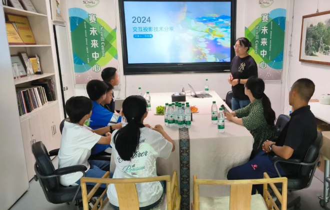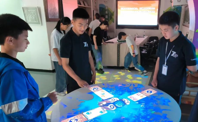 同学们一走进国术科技“赛未来中心”,就沉浸在由“赛未来商用教育游戏机器人”所营造的炫酷环境中。同学们都跃跃欲试,迫不及待地想亲身体验。在科普老师的指导下,大家体验了“丛林轶事”“怪兽牌局”“沙漠之战”等地面交互、桌面交互等科普节目。多种多样的游戏玩法、流畅无卡顿的游戏体验,给同学们留下了深刻印象,激发了大家对交互投影技术的探究欲。