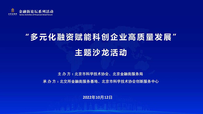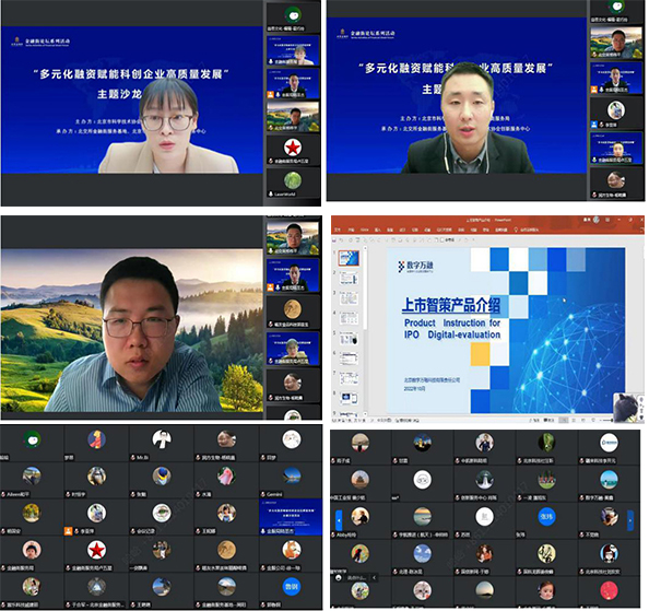 10月12日下午,由 、北京金融街服务局共同主办,北京证券交易所金融街服务基地、 创新服务中心承办的“金融街论坛系列活动——多元化融资赋能科创企业高质量发展”主题沙龙活动通过线上形式举办,来自首都及全国各地科创企业及相关领域近百家单位120余名代表参会交流。